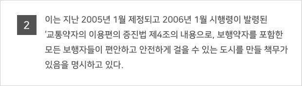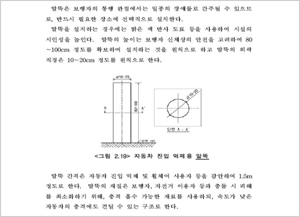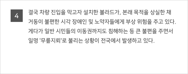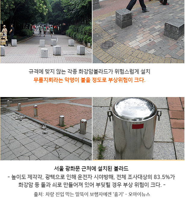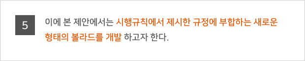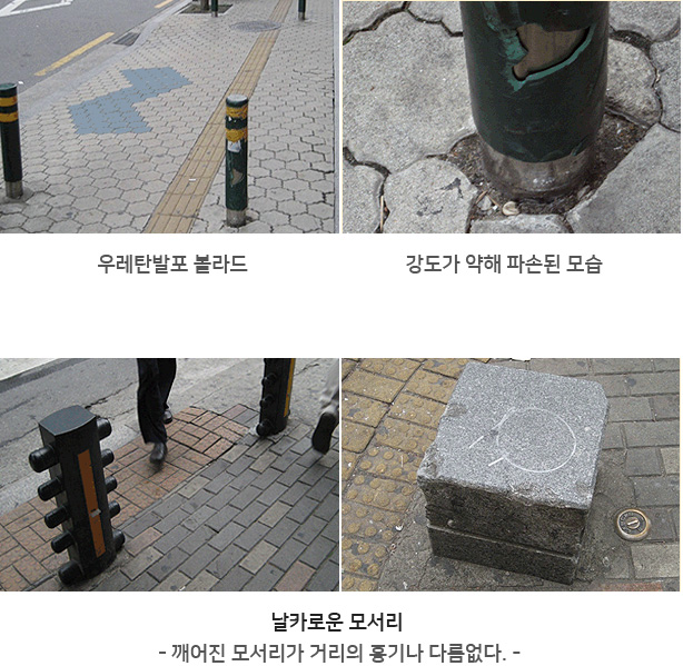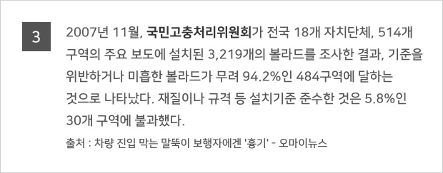 º¼¶óµå´Â Â÷·®ÀÇ º¸µµÁøÀÔ ¹æÁö¸¦ À§ÇÑ °ÍÀ¸·Î Áö³ 2006³âºÎÅÍ ½ÃÇàµÈ "±³Åë ¾àÀÚÀÇ À̵¿ÆíÀÇ ÁõÁø¹ý"Àº º¼¶óµåÀÇ ¼³Ä¡¸¦ ¹ýÀ¸·Î ±ÔÁ¤Çϰí ÀÖ´Ù. ±³Åë¾àÀÚÀÇ À̵¿ÆíÀÇ ÁõÁø¹ý ½ÃÇà±ÔÄ¢ Á¦9Á¶¿¡ µû¸£¸é, º¼¶óµå´Â º¸ÇàÀÚÀÇ ¾ÈÀüÇÏ°í Æí¸®ÇÑ ÅëÇàÀ» ¹æÇØÇÏÁö ¾Æ´ÏÇÏ´Â ¹üÀ§ ³»¿¡¼ ¼³Ä¡ÇϵÇ, ¹àÀº »öÀÇ µµ·á µîÀ» »ç¿ëÇØ ½±°Ô ½Äº°ÇÒ ¼ö ÀÖ¾î¾ß Çϸç, ³ôÀÌ´Â º¸ÇàÀÚÀÇ ¾ÈÀüÀ» °í·ÁÇØ 80~100cm ³»¿Ü, Áö¸§Àº 10~20cm·Î ¼³Ä¡µÇ¾î¾ß ÇÑ´Ù. º¼¶óµå ¼³Ä¡ °£°Ý ¿ª½Ã Àå¾ÖÀεéÀÇ ÈÙü¾î¿Í À¯¸ðÂ÷ µîÀÇ ÅëÇàÀ» À§ÇØ, °£°ÝÀº 1.5m·Î À¯ÁöÇØ¾ß ÇÏ¸ç ¿ì·¹ÅºÀ̳ª ÇÃ¶ó½ºÆ½ µî º¸ÇàÀÚÀÇ Ãæ°ÝÀ» Èí¼öÇÒ ¼ö ÀÖ´Â Àç·á·Î ¸¸µé¾îÁ®¾ß ÇÑ´Ù. ¶ÇÇÑ ½Ã°¢Àå¾ÖÀεéÀÇ Ãæµ¹ ¹æÁö µî ¾ÈÀüÀ» À§ÇØ 30cm Àü¹æ¿¡´Â Á¡Çü ºí·ÏÀ» ¼³Ä¡ÇØ¾ß ÇÑ´Ù.