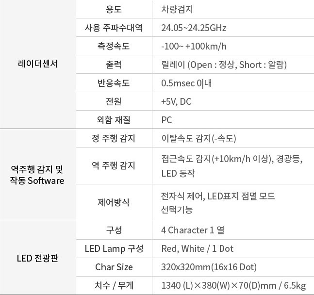'·¹ÀÌ´õ ¼¾¼, ¾Ë¶÷ °æ±¤µî, LED Àü±¤ÆÇ, ž籤 µîÀÇ ¿©·¯ ±â±âÀÇ °áÇÕÀ¸·Î ±¸¼ºµÈ Á¦Ç°À¸·Î¼, ·¹ÀÌ´õ ¼¾¼¸¦ ÅëÇØ ÁÖ.¾ß°£¿¡ µµ·Î¿¡ ¿ªÁÖÇàÀ¸·Î ÁøÀÔÇÑ Â÷·®À» °¨ÁöÇÏ¿© Áï½Ã ¿ªÁÖÇà Â÷·® ¿îÀüÀÚ¿¡°Ô ½Ãû°¢ °æ°í ¸Þ½ÃÁö¸¦ ¿¬ÃâÇÔÀ¸·Î½á ¿ªÁÖÇàÀ¸·Î ÀÎÇÑ »ç°í¸¦ ¹Ì¿¬¿¡ ¹æÁöÇÏ´Â ¿ªÁÖÇà¹æÁö¾ÈÀü½Ã¼³ÀÌ´Ù.